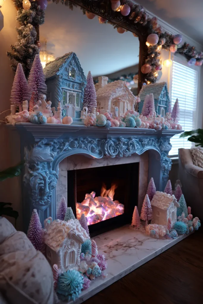 Oh my goodness, I seriously can’t get over how gorgeous this is, it’s like an elevated, grown-up version of a classic Christmas village. The soft blues, pinks, and purples are just so dreamy and elegant while still hitting that playful Candyland note we are all loving right now. I feel like I could spend hours just looking at all the tiny details on those little houses and the way the firelight makes the faux icing sparkle. This setup is truly impressive and makes the whole room feel warm, magical, and utterly sweet.