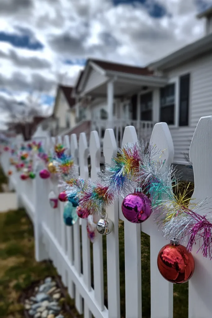 This charming suburban street scene features a classic white picket fence that has been jazzed up with a wonderfully bright, playful garland perfect for a Candyland theme. The garland is made from fluffy, multi-colored tinsel in iridescent shades of pink, blue, yellow, and silver, creating a rainbow effect that really pops against the bright white wood. Dangling from this vibrant tinsel are shiny, oversized spherical ornaments in jewel tones like magenta, turquoise, and silver, bringing that classic ornament look into the outdoor decor. The depth of field focuses right on the closest decorations, blurring the friendly neighborhood homes in the background under a dramatic, cloudy sky.
