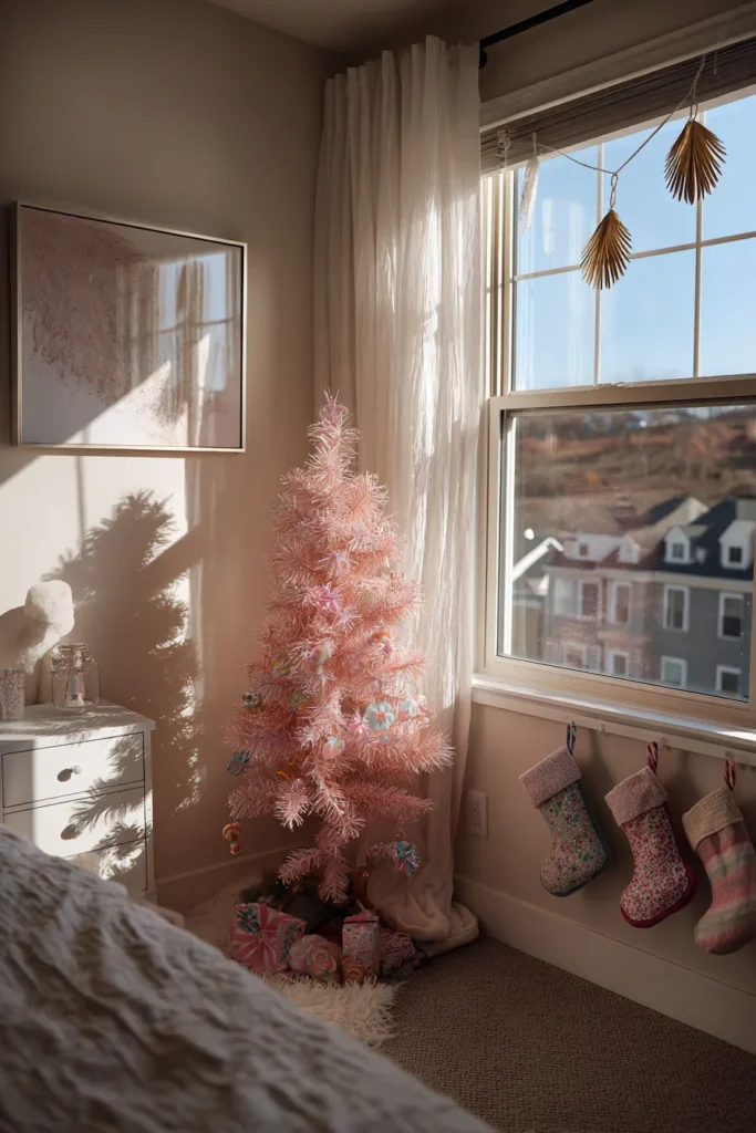 This cozy corner of a bedroom showcases a sweet, soft holiday setup perfect for a personal retreat with a Candyland touch. The centerpiece is a small, fluffy pink Christmas tree decorated with pastel ornaments that look like tiny sweets and a few small candy cane accents. This little tree sits near a bright window draped with sheer white curtains that filter the beautiful morning or afternoon sunlight, casting long shadows across the carpeted floor. Below the window, a row of charming, mismatched floral and striped stockings hangs neatly, adding a homey, traditional element to the otherwise modern pastel decor.