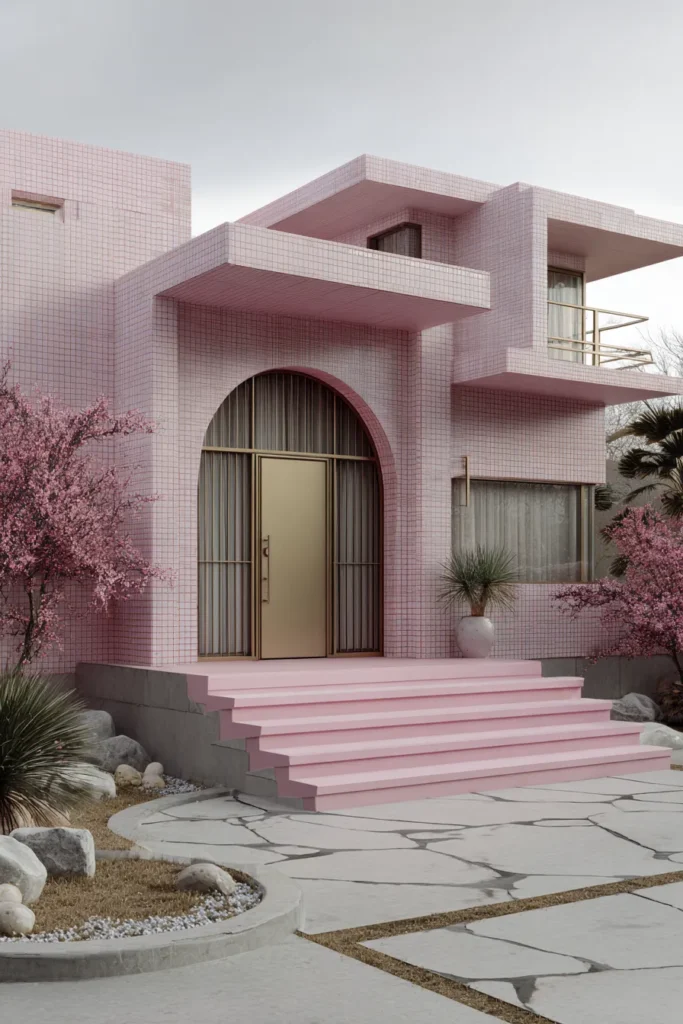 This home embraces a bold, mid-century modern or contemporary architectural style completely enveloped in a pale bubblegum pink tile mosaic. The structure features sharp, layered overhangs and an elegant, imposing arched entryway with a striking gold door. A wide staircase leading up to the entrance is also finished in the matching soft pink, contrasting beautifully with the surrounding grey, cracked-stone patio and natural landscaping featuring vibrant pink blossoming trees. The overall look is incredibly stylized and fashion-forward, using the single pastel color to define every exterior surface.