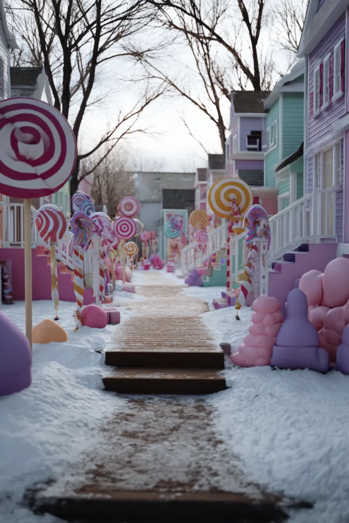 This image transports us right into the middle of a magical, edible wonderland designed to look like a charming, pastel-colored neighborhood blanketed in snow. A wooden walkway leads down the center, flanked by snow-covered lawns dotted with giant, oversized candy decorations like swirl lollipops and candy cane stakes. The quaint houses lining the street are painted in soft shades of lavender, mint green, and light pink, further emphasizing the sweet, almost dreamlike atmosphere. Even the bare tree branches against the pale sky hint at a chilly but sweet winter scene.