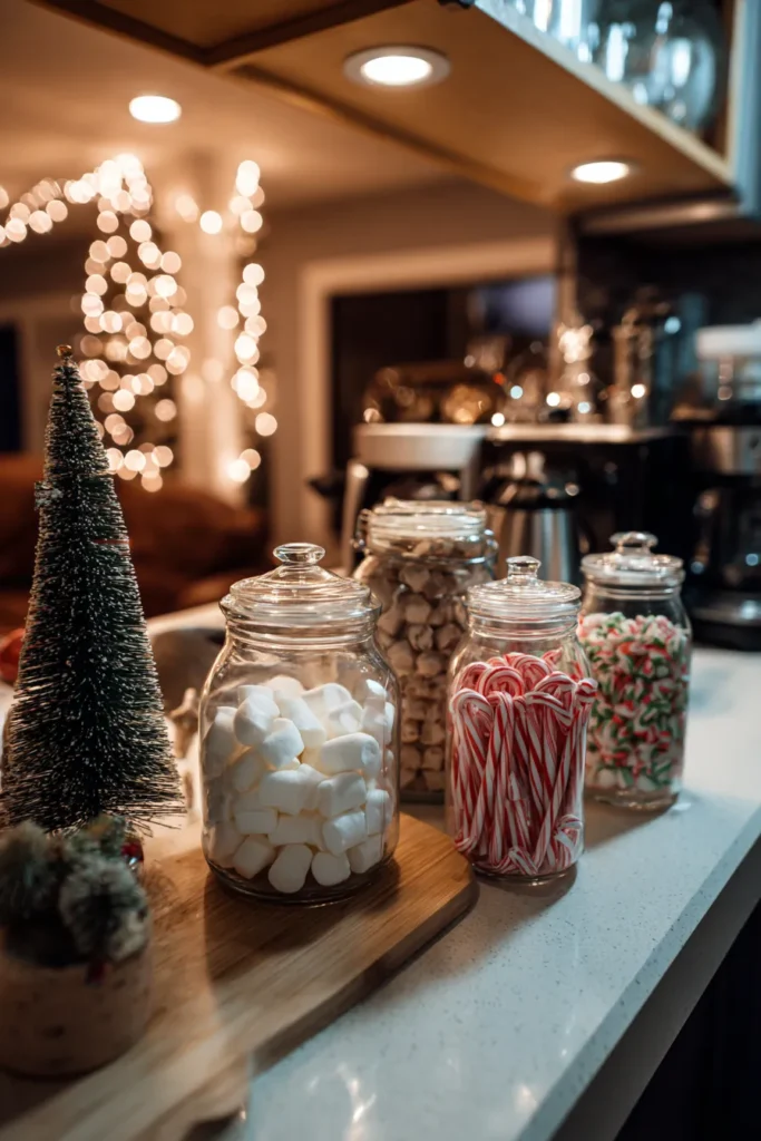 This picture perfectly captures the cozy, inviting setup of a dedicated holiday hot cocoa bar, ideal for indulging in sweet Christmas cheer indoors. Several clear apothecary jars filled with classic treats line a bright, clean countertop, resting on a warm wooden serving board. We see fluffy white marshmallows, perfectly stacked red and white striped candy canes, and a jar of colorful peppermint crunch candies, all ready to be spooned into a mug. The background is soft and warm, lit by the beautiful, out-of-focus bokeh of twinkling string lights, creating an intimate and cozy evening atmosphere.