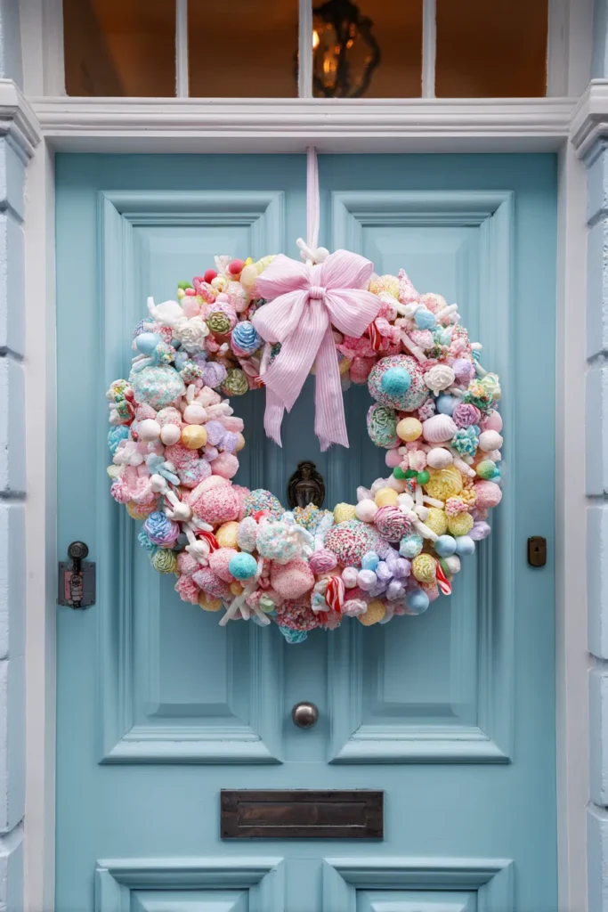 I am completely obsessed with this wreath it looks like it was made from every single sweet thing you could imagine. The combination of the light blue door with all those gentle pastel textures is just so pretty and welcoming for the holidays. It’s definitely a unique take on Christmas wreaths that feels super lighthearted and perfect for someone who loves soft colors. I think this design is beautiful because it’s so detailed and instantly makes you feel like you are about to step into the sweetest little holiday cottage.