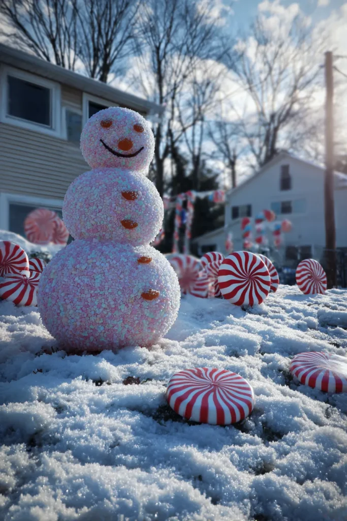 This outdoor setting instantly screams winter wonderland meets sugary paradise with a heavy emphasis on classic red and white peppermint candies. The ground is covered in bright white, sparkly material mimicking fresh snow, creating a perfect canvas for the large, flat peppermint swirl decorations scattered across the lawn. Standing tall in the foreground is a charming snowman whose body is textured with what looks like tiny pink and white iridescent sequins, giving it a fun, sugary shimmer instead of traditional snow. In the background, more peppermint discs and slightly blurred pastel decorations suggest an entire street or neighborhood is participating in this sweet theme under a bright, crisp sky.