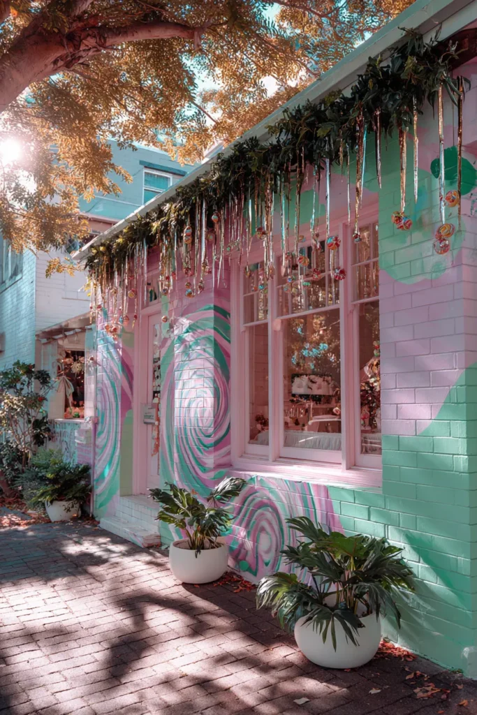 This exterior features a playful transformation of a brick building using massive, swirling murals in shades of bright pink and cool mint green, creating a vibrant, almost dizzying effect that mimics giant lollipops. The trim around the large storefront windows and the door is painted a soft pink, matching the pale bricks. Hanging from the awning is a whimsical garland made of dark greenery interspersed with dangling, shiny accents and small, round, colorful ornaments that catch the bright sunlight filtering through the tree canopy overhead. Large, healthy potted plants sit on the cobblestone walkway, adding a touch of natural texture to the sugary scene.