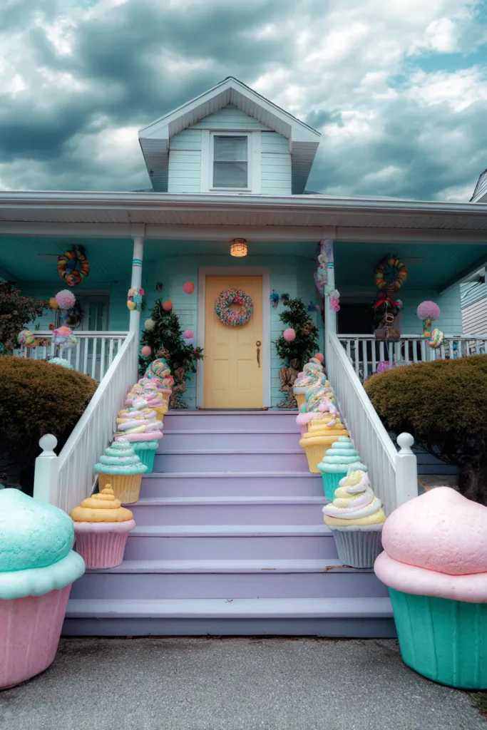 I absolutely adore this decoration idea, it’s so much fun and incredibly eye-catching against the traditional porch structure. Imagine coming home every day and being greeted by these huge, sweet-looking treats it just instantly brightens your mood. I think it’s so impressive how they used such large-scale props to completely redefine the entrance, making it feel like a sweet shop facade. It’s the perfect blend of festive fun and playful pastel color blocking that I just can’t get enough of.