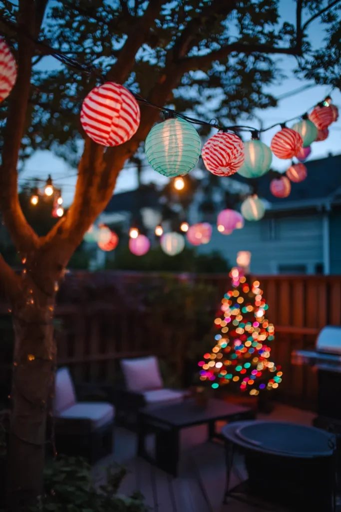 This cozy outdoor deck space is made festive with a beautiful mix of string lights creating a magical evening ambiance perfect for sharing treats. The defining feature overhead is a string of paper lanterns draped across the tree branches, featuring alternating red and white stripes reminiscent of classic candy canes, alongside solid pastel blue and pink lanterns that add softness. A small, brightly lit Christmas tree with multi-colored bokeh lights sits on the deck, drawing the eye toward the seating area, all set against the deep blue twilight sky and warm glow spilling from the house windows.