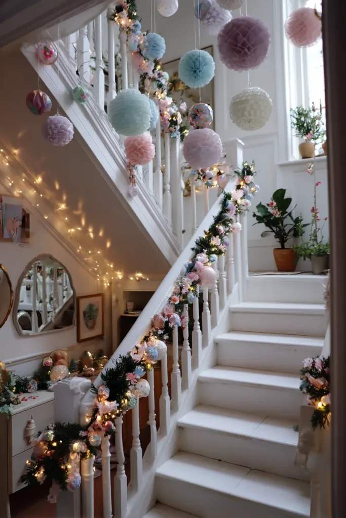 I absolutely adore how light and ethereal this decoration scheme is, it feels like a gentle winter dream rather than a hard holiday look. The combination of the fluffy paper lanterns hanging above and the delicate pastel garlands lining the stairs creates such a gorgeous layered effect, making the entire stairwell feel special. It’s such an impressive way to utilize vertical space, and the soft lighting makes everything look so warm and cozy, like walking up to the sweetest part of the house.