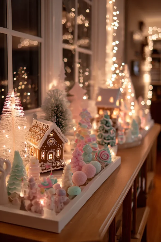 This display is incredibly beautiful because it perfectly mixes cozy Christmas tradition with soft, sweet Candyland fantasy. I am in love with the glowing gingerbread house acting as the anchor for all those fluffy, pastel candies and frosted trees. The warm bokeh from the string lights makes everything look so soft and inviting, like the whole scene is dusted in fairy dust. It’s such an impressive and sweet way to decorate a smaller area and add a lot of concentrated holiday magic to a room.