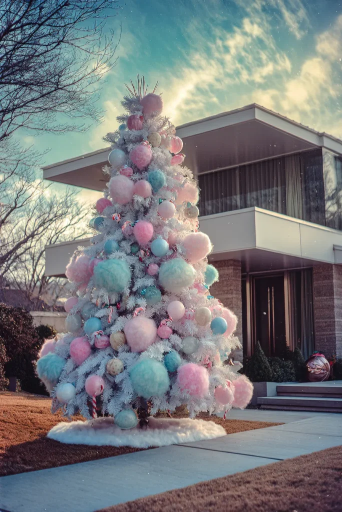 I think this outdoor tree is simply show-stopping, it captures the absolute dreamiest version of Candyland Christmas. The contrast between the modern, somewhat severe architecture in the background and this soft, fluffy, pastel masterpiece is just brilliant. It’s so impressive because it completely flips the script on traditional outdoor holiday decor; I’m totally inspired to get a white tree now and go heavy on the soft textures. It looks so whimsical and inviting, making the whole property feel like a magical winter confection.