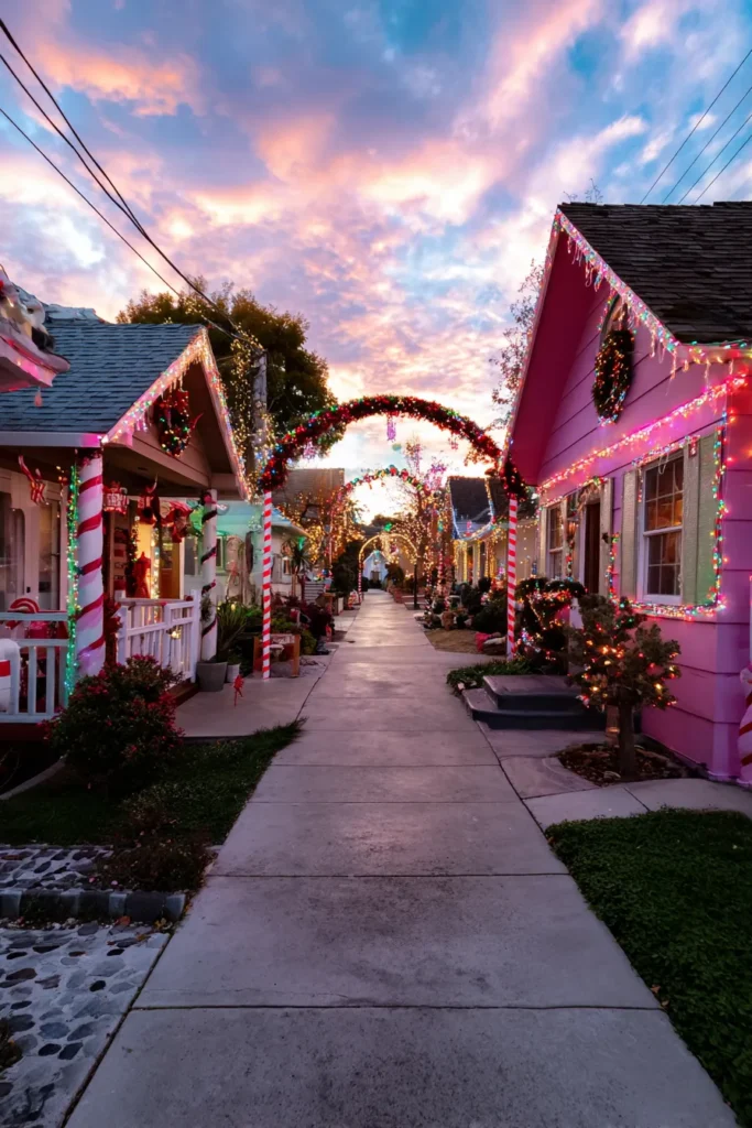 Oh my gosh, this is the ultimate Candyland fantasy come to life, and I am totally here for it. The scale of those giant lollipops is just fantastic, making everything feel delightfully whimsical and perfect for a holiday photo shoot. I love the idea of having a whole street dedicated to this playful color scheme, especially with the snowy ground making those pastel houses glow. It’s such an impressive and immersive way to capture that fun, playful holiday spirit we all secretly wish for during Christmas time.