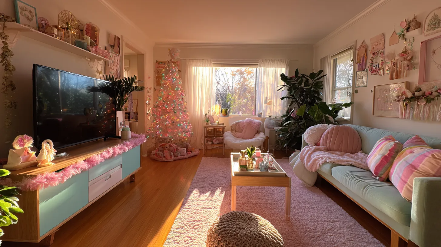 I just adore how this corner feels so personal and incredibly serene, like my own little candy cloud nook. The pink tree against the neutral wall and the abundance of natural light makes the whole space feel so airy and bright. It’s such an impressive blend of sweet themes with a sophisticated, soft color palette that keeps it feeling adult and calming, not overly juvenile. If you want a little spot just for you to feel the holiday magic, this softly lit corner is total bedroom goals.