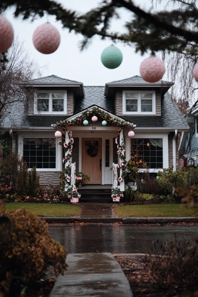 I think this exterior decor is just lovely because it manages to feel festive and whimsical without being over-the-top bright, which I really appreciate. The muted colors work so well with the slightly moody, damp weather and the traditional house structure. It’s impressive how the pastel ornaments soften the entire facade, giving it a unique, sugary feel that is perfect for a gentle Candyland holiday vibe. I would totally feel joyful walking up to this door on a chilly, grey afternoon.