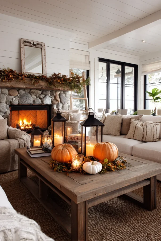 This living room captures the essence of farmhouse coziness with its stone fireplace, rustic wooden mantle, and white shiplap walls. A chunky wooden coffee table holds an inviting arrangement of pumpkins, lanterns, and glowing candles that cast a soft light across the room. Neutral-toned sofas filled with textured pillows add to the relaxed warmth, while the flickering fire pulls everything together for an autumn-ready atmosphere.
