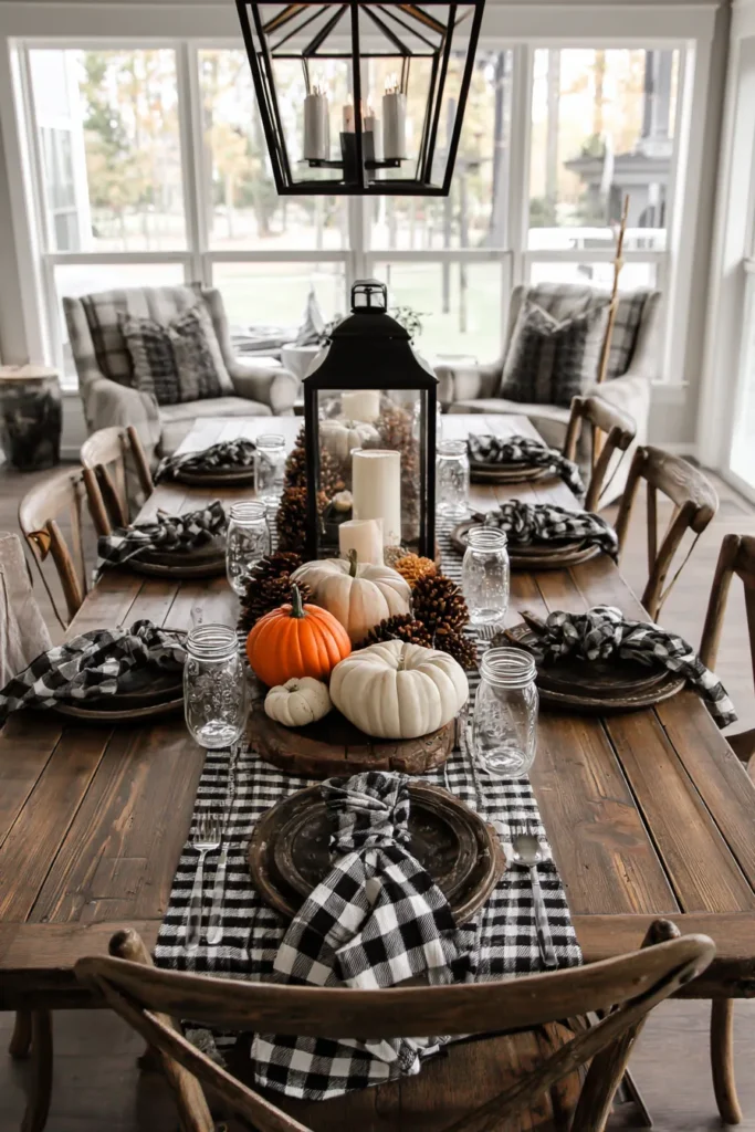 This dining area combines classic farmhouse textures with seasonal charm. A long wooden table is set with dark plates, glass jars for drinks, and black-and-white buffalo check napkins that tie everything together. The centerpiece is a beautiful mix of white and orange pumpkins surrounded by pinecones and a lantern, creating the perfect rustic yet refined tablescape.