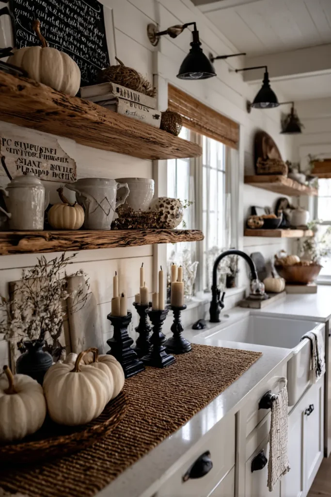 This farmhouse kitchen makes use of open wooden shelves filled with white ceramics, stacked vintage books, and scattered pumpkins in creamy tones. A woven runner across the counter adds texture, while black candleholders with slender tapers bring height and drama. The soft glow of light streaming through the window highlights the mix of natural wood and crisp white cabinetry, giving the space a rustic yet polished look.