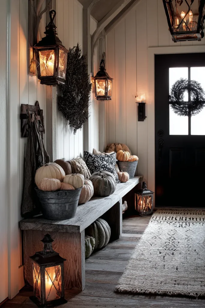 This entryway is full of rustic charm, with wooden benches lined in cozy pillows and galvanized buckets brimming with pumpkins in every shade. Black lanterns glow softly from the floor and walls, casting a golden light that immediately makes the space feel inviting. The simple black wreath on the door ties the look together while keeping the farmhouse feel intact.