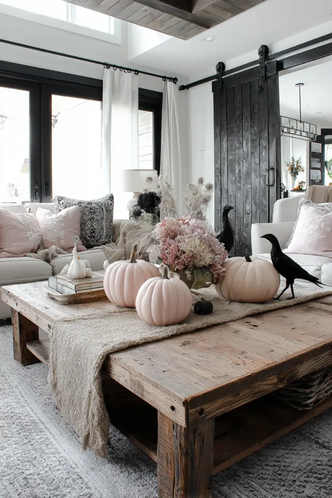 This living space takes a softer spin on farmhouse Halloween style. Pale pink pumpkins line the rustic coffee table alongside dried florals in muted tones, creating an unexpected yet beautiful palette. Black crows add a playful seasonal edge, while cozy pillows and throws in blush and cream shades keep the space warm and inviting. The sliding barn doors and wood beams complete the rustic farmhouse backdrop.
