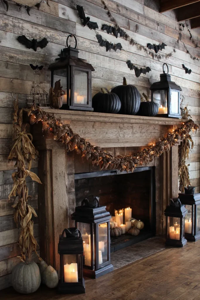 This farmhouse mantle takes on a moody Halloween feel with black pumpkins, tall lanterns, and a garland of dried foliage twinkling with tiny lights. The reclaimed wood backdrop and hanging bat garland add just the right amount of playful spookiness while keeping everything grounded in rustic charm. Candle clusters inside the fireplace complete the look with a soft golden glow.