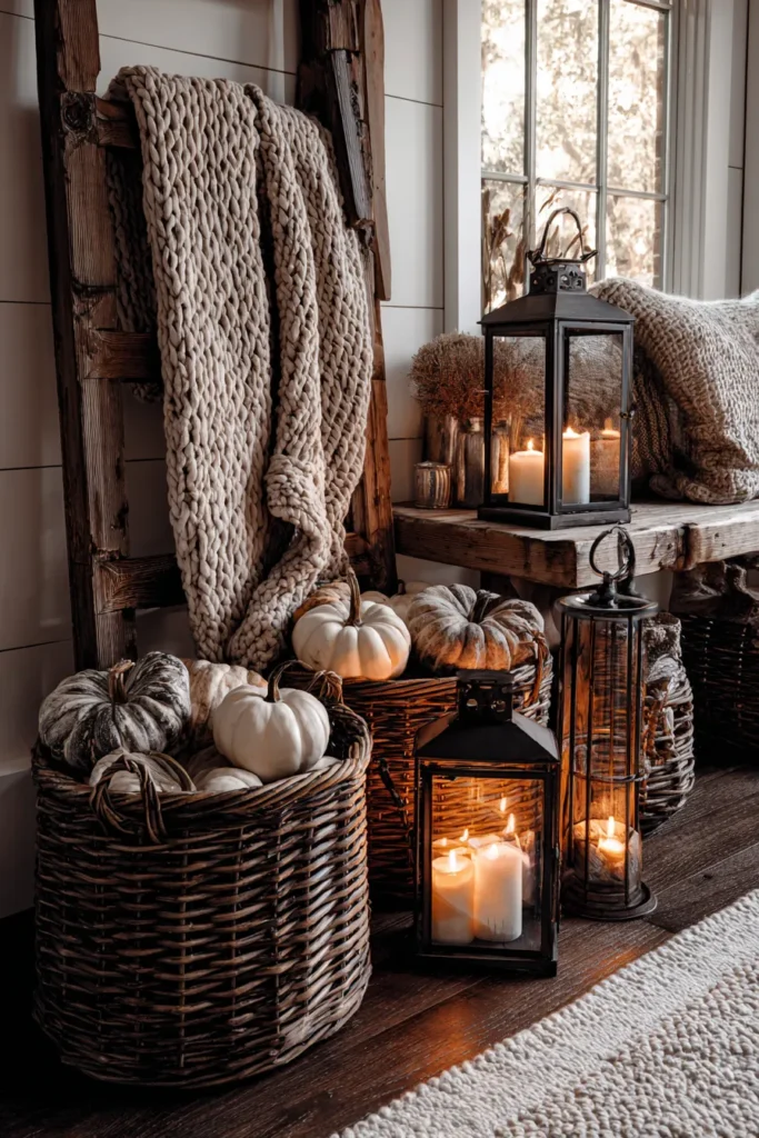 What makes me smile here is how practical this setup feels while still looking beautiful. The chunky knit and lanterns create such a cozy autumn mood, and the pumpkins scattered in baskets keep it playful and relaxed. It’s the kind of decorating that makes a room feel instantly homier.