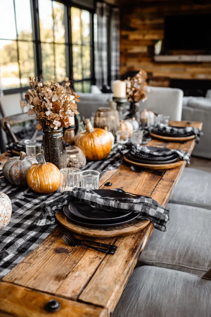 This dining table sets the stage for a festive farmhouse meal with a buffalo check runner, rustic wood plates, and pumpkins in rich orange and muted tones. Dried floral arrangements in glass jars add height and texture, while flickering candles bring a soft light across the table. The combination of dark dishware and warm wood creates a moody yet welcoming vibe.