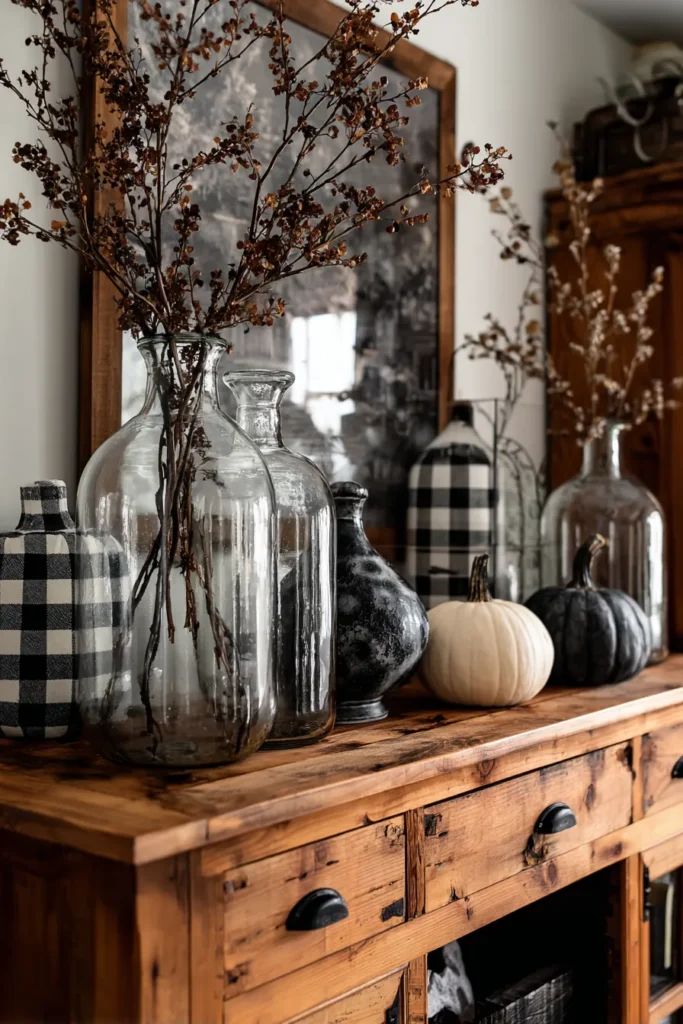 This console table makes a farmhouse statement with oversized glass vases filled with dried branches, paired with pumpkins in white and black. A few buffalo check accents are worked in through fabric-covered bottles, giving the space a seasonal farmhouse twist. The natural wood of the console grounds the look, adding warmth and character.