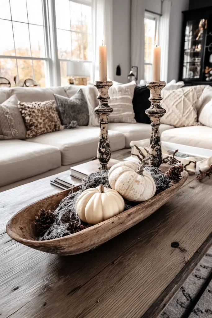 This living room table is styled with an aged wooden dough bowl filled with cream pumpkins, pinecones, and wisps of Spanish moss. Two distressed candleholders with glowing tapers bring height and charm to the centerpiece, while the soft pillows in muted tones on the sofa in the background complete the farmhouse aesthetic.