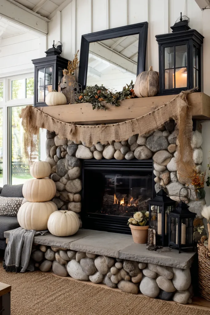This fireplace stands out with its stacked stone surround, rustic wood mantel, and soft burlap garland draped across the top. Pumpkins in shades of cream are stacked beside the hearth, while tall black lanterns add a striking contrast. A large black-framed mirror above the mantel ties the whole scene together.