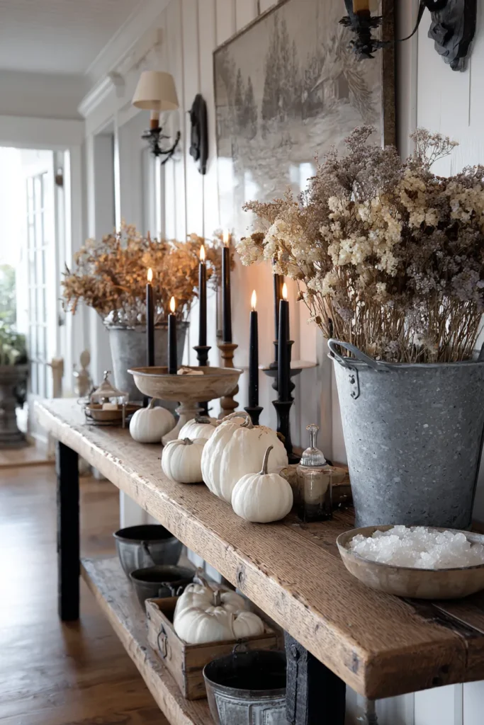 This console table is beautifully layered with galvanized buckets filled with dried florals, black taper candles in rustic holders, and creamy pumpkins scattered across the surface. The weathered wood and mix of natural elements give it a rustic personality, while the dark candles add a little Halloween mystery.