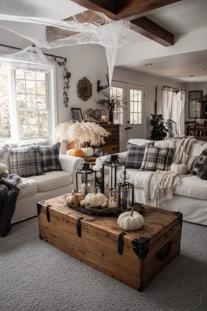 This cozy living room sets the scene with a wooden trunk serving as a coffee table, topped with lanterns, cream pumpkins, and gold accents. White sofas layered with plaid pillows and chunky throws create the ultimate farmhouse look, while cobwebs draped from the beams add just a whisper of Halloween fun. The mix of textures makes the space feel both lived-in and seasonal.