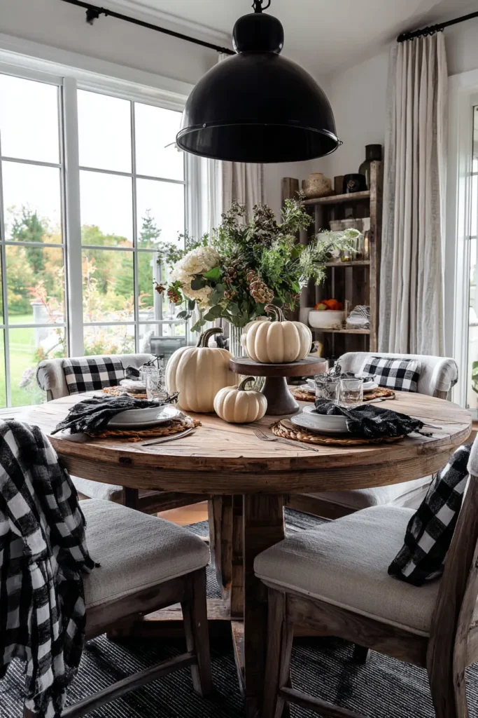 This dining nook is beautifully styled with a round rustic table topped with white pumpkins arranged at different heights. Plaid napkins and cozy chairs bring in classic farmhouse touches, while a bold black pendant light overhead anchors the space. The greenery centerpiece adds freshness and balances the soft autumn tones.