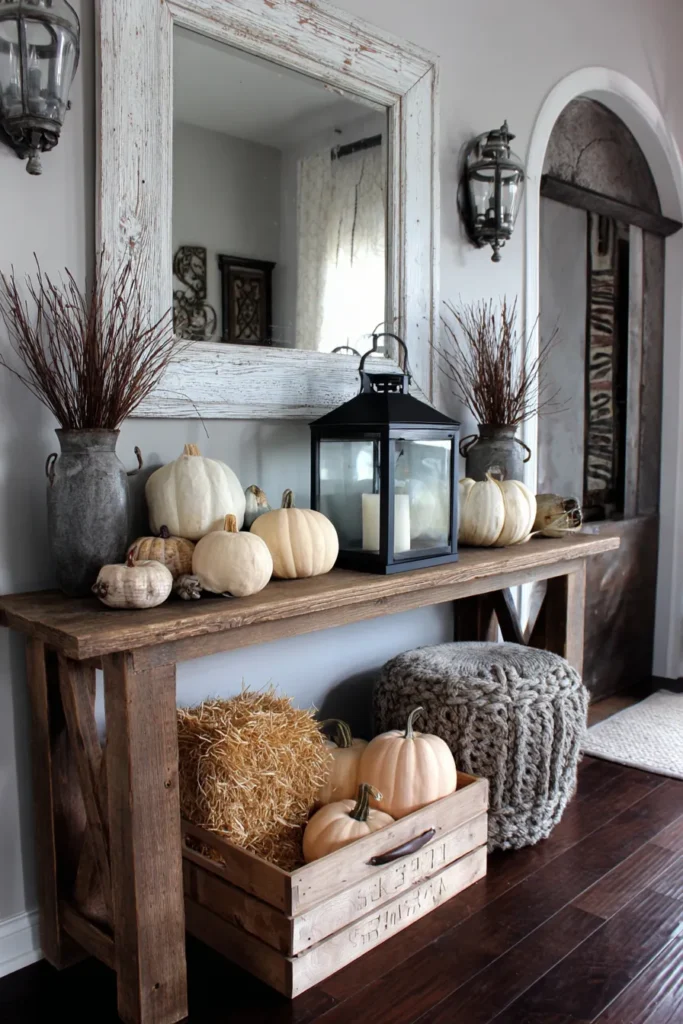 This entry console combines natural farmhouse elements with seasonal details. Pumpkins in creamy shades are scattered across the top, paired with rustic lanterns and vases filled with twigs. A wooden crate filled with straw and pumpkins sits underneath, adding another layer of texture. The distressed mirror above reflects light, giving the space an airy feel.