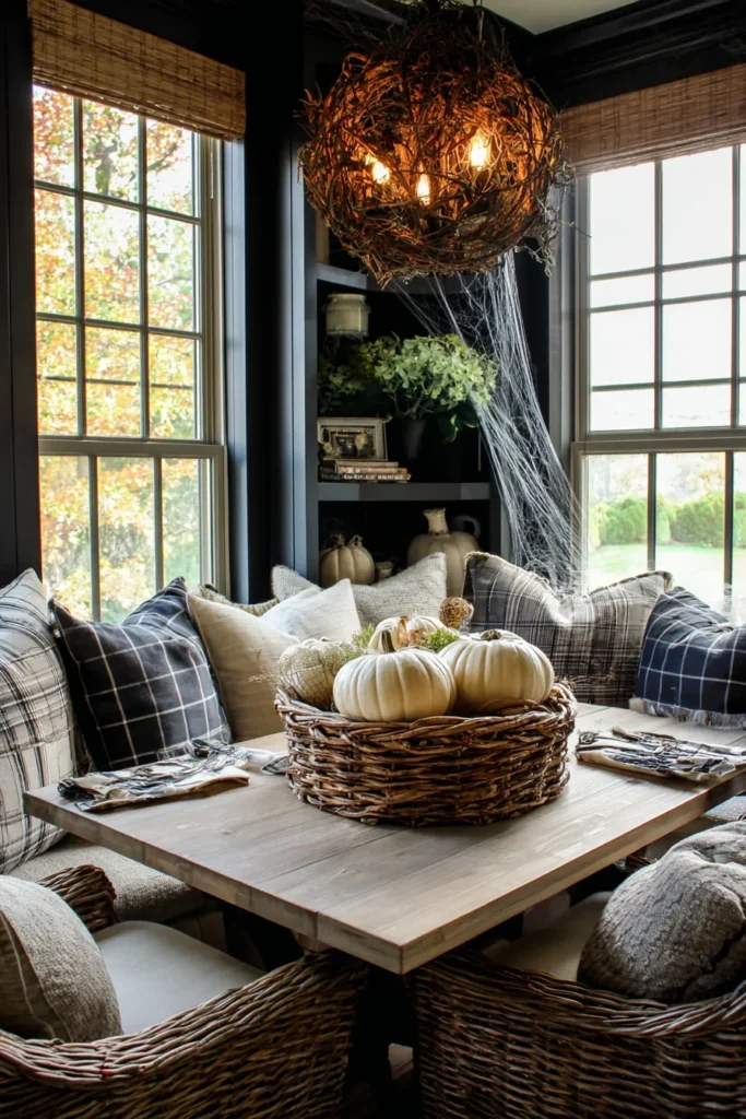 This breakfast nook is full of charm, with wicker chairs and a wooden table topped by a large basket overflowing with white pumpkins. Plaid pillows in shades of gray and cream line the benches, while a twig chandelier overhead adds a dramatic rustic touch. A hint of cobweb detail makes it just spooky enough for the season.