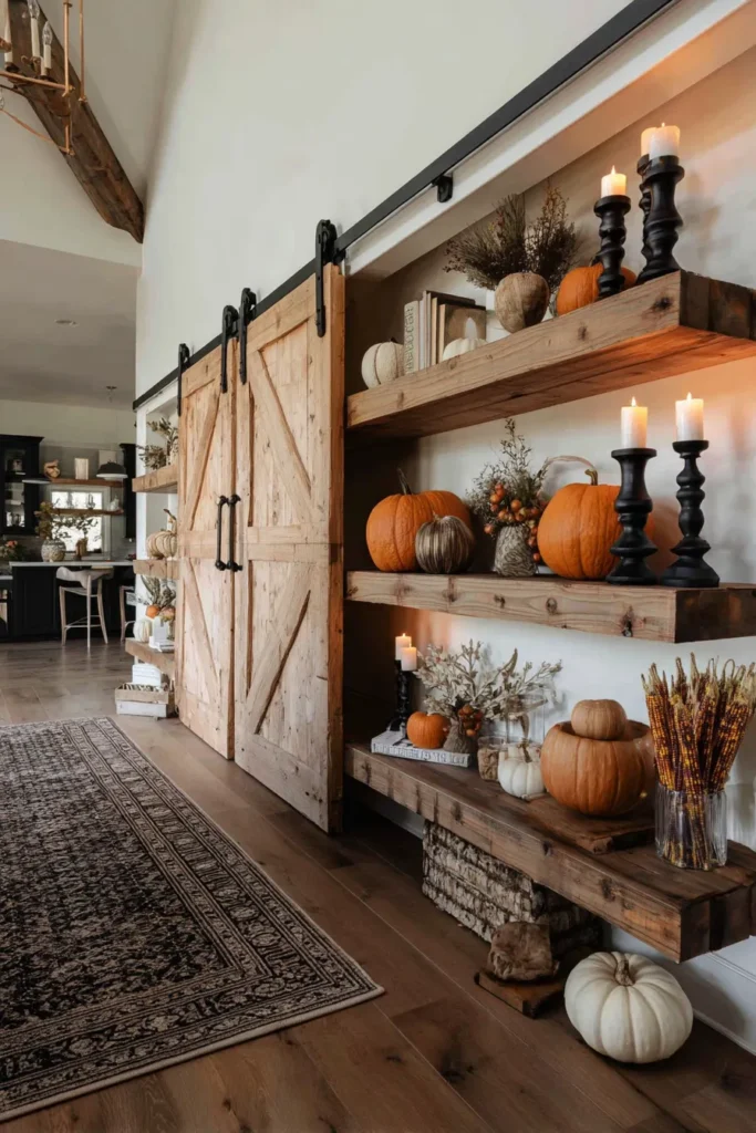 This farmhouse hallway makes a big statement with sliding barn doors framed by floating wooden shelves styled for the season. Pumpkins in different shapes and sizes fill the shelves, alongside black candleholders, vintage books, and dried florals. The warm glow of candles makes the whole space feel intimate and dramatic.