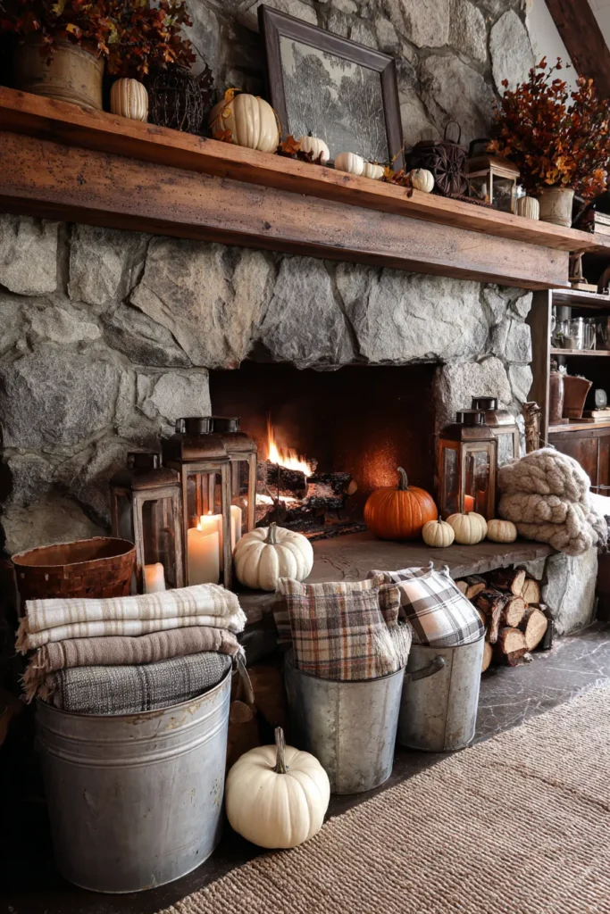 This fireplace is surrounded by rustic stone and topped with a solid wooden mantle styled with pumpkins, autumn foliage, and vintage accents. The hearth is filled with lanterns, glowing candles, and cozy plaid throws folded neatly in galvanized buckets, creating the ultimate farmhouse look. The warm firelight ties everything together in a way that feels inviting and timeless.