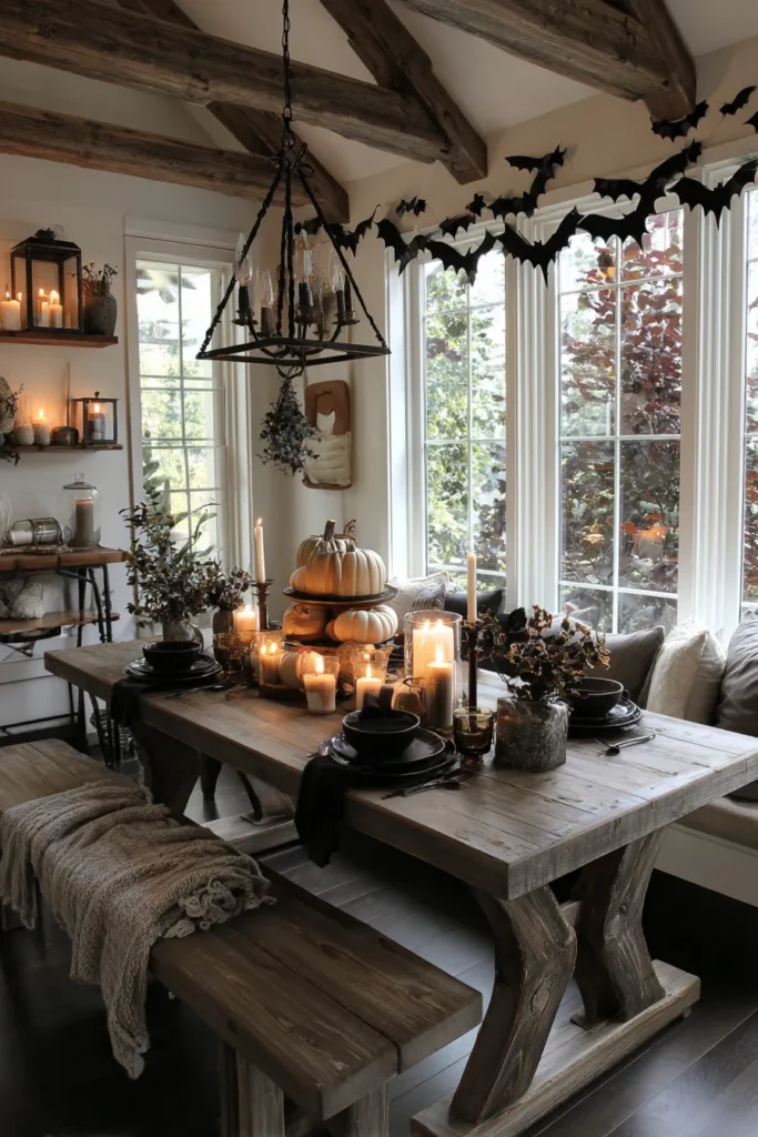 This farmhouse dining space is enchanting with its long wooden table, stacked pumpkin centerpiece, and rows of flickering candles. Black dishware contrasts beautifully with the natural wood tones, while bats strung across the window add a touch of playful Halloween drama. Rustic beams overhead complete the moody farmhouse setting.