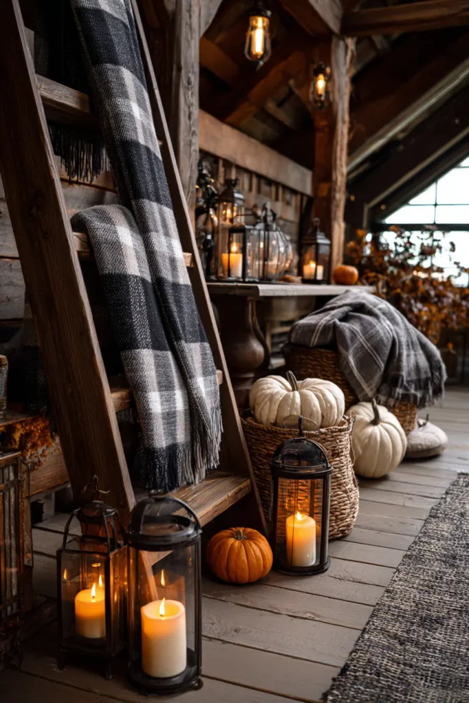 This loft corner is brimming with farmhouse coziness, featuring baskets filled with pumpkins, plaid blankets draped casually, and lanterns lined up to cast a golden light. A rustic ladder leans against the wall, adding height and texture, while the dark wood beams above create a snug, cabin-like atmosphere.