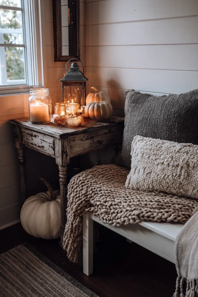 This little nook feels effortlessly charming with a rustic side table styled with pumpkins, glowing candles, and a vintage lantern. A chunky knit throw is draped across the bench, layered with soft farmhouse pillows for added comfort. The whole setup feels intimate and welcoming, especially with the candlelight bouncing off the shiplap walls.