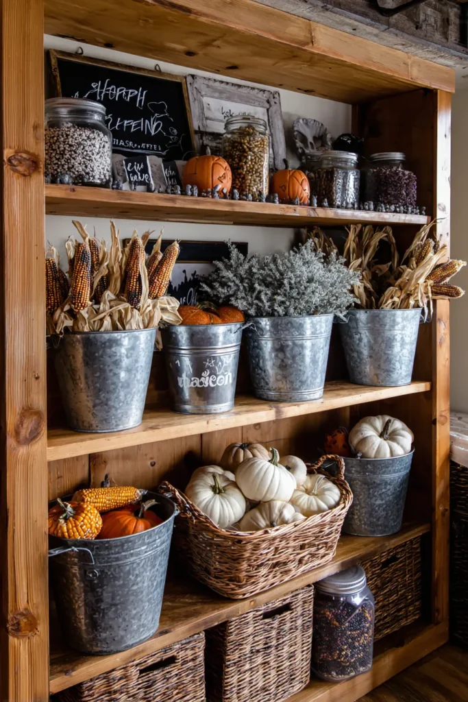 This cozy farmhouse pantry shelf is styled with galvanized buckets filled with dried corn stalks, pumpkins, and silvery greenery that add instant harvest charm. Woven baskets, mason jars, and chalkboard accents tie everything together, making it feel like an inviting little corner straight out of a countryside market. The mix of textures between metal, wicker, and wood gives it that warm rustic balance we all love in fall decorating.