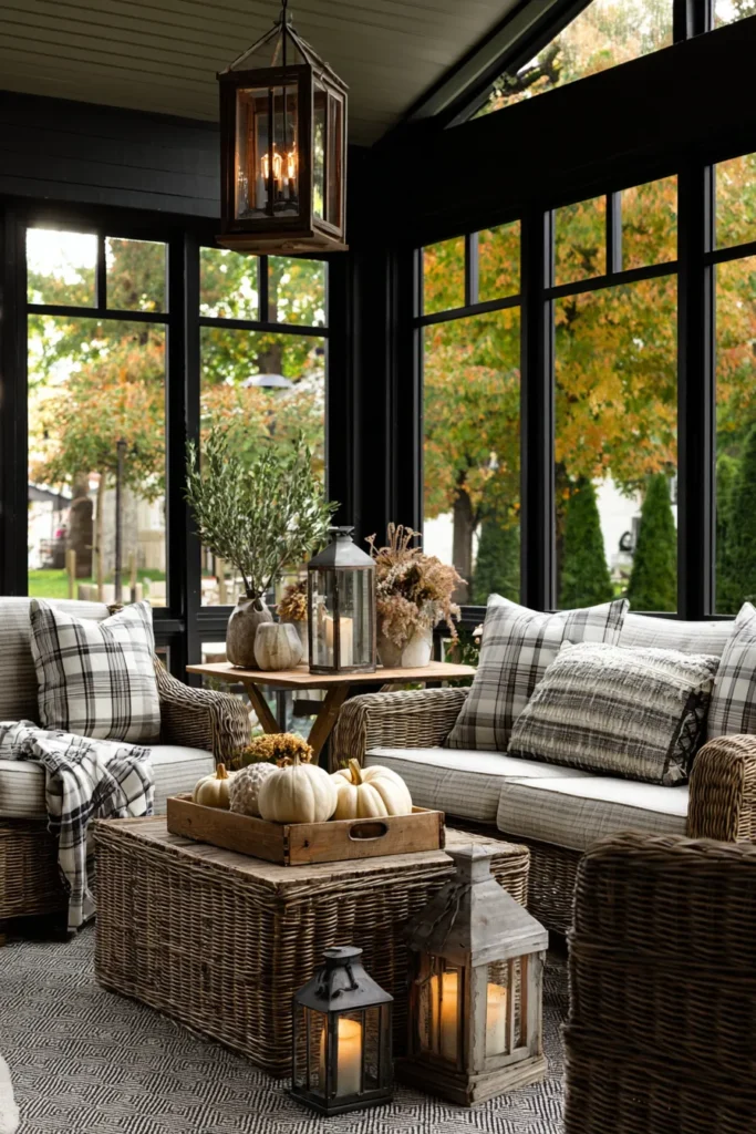 This sunroom is all about comfort with its wicker furniture, plaid cushions, and soft layers of neutral tones that let the fall accents shine. A rustic wooden tray of pumpkins paired with lanterns glowing softly on the floor creates the perfect seasonal touch without overwhelming the space. The large windows bring in views of autumn trees, making it feel like an extension of the outdoors.