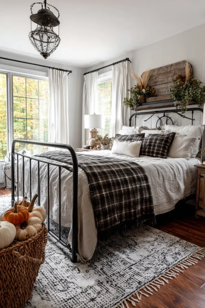This farmhouse bedroom layers soft linens, plaid pillows, and rustic textures for the perfect fall-ready retreat. A woven basket filled with pumpkins at the foot of the bed adds a seasonal twist, while greenery above the headboard balances the space with natural charm. The overall vibe is calm, welcoming, and oh-so-perfect for the cooler months.