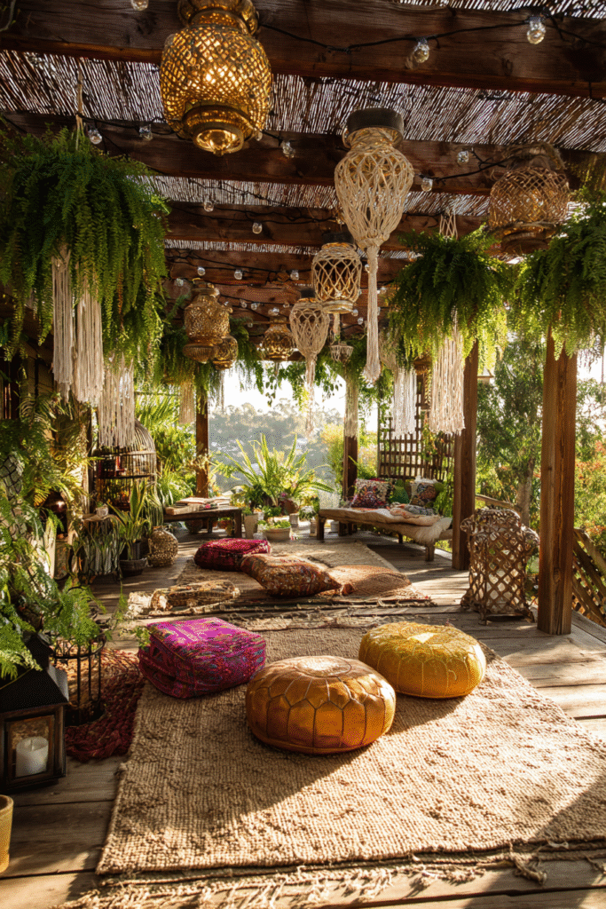 This incredible space transforms a simple structure into a bohemian jungle canopy using an abundance of hanging plants, woven textiles, and oversized floor cushions. The pergola itself is a humble wood frame, but the sheer volume of greenery, coupled with woven light fixtures and warm lighting, creates an atmosphere that is deeply layered and cozy. This is the perfect spot for an afternoon tea or just lounging with your best girlfriends.