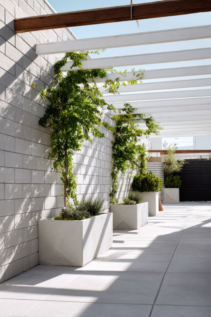 I am totally obsessed with the modern, minimalist feel of this design and how the white color makes the entire space feel so crisp and open—it’s pure sophistication! The wall of green is such a clever way to add natural texture and privacy, proving that simple paint and strategic planting can make a huge impact on a budget. This is the ultimate inspiration if you love a high-contrast, architectural look for your patio or garden!