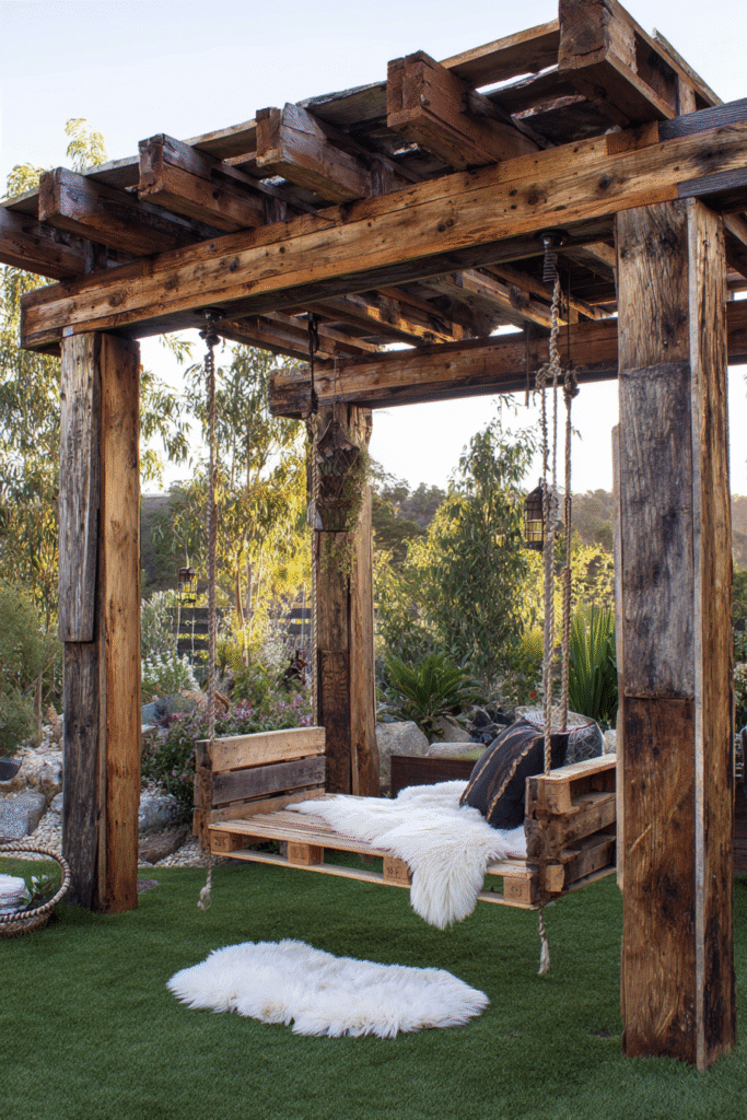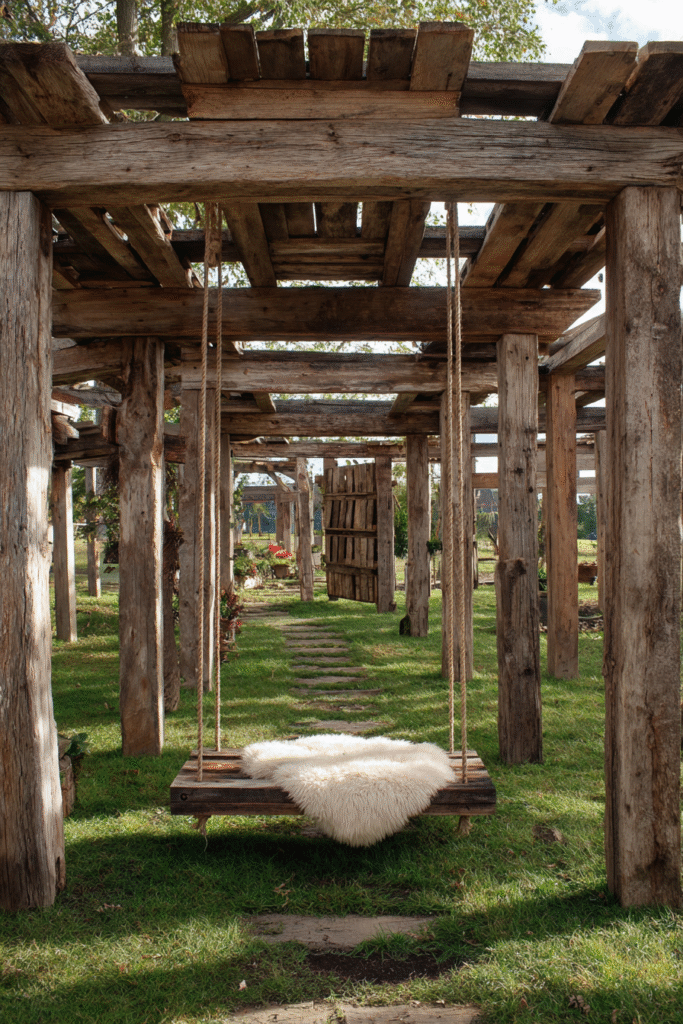 I absolutely love how cozy and delightfully unexpected this is—who wouldn’t want a fluffy swing under their pergola? It transforms the structure into a functional piece of outdoor furniture, and the rustic wood just adds to that charming, country chic appeal. It’s such an inspiring design that reminds us to add a little bit of whimsy and comfort to our outdoor spaces, making them the perfect spot to curl up and escape!