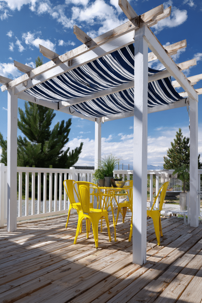 This design is a total summer mood, showcasing a simple white-painted pergola frame that is instantly dressed up with a fun navy and white striped fabric canopy. The bold pattern provides a playful sense of shade over a small wooden deck, and the bright yellow chairs underneath add a fantastic, sunny pop of contrasting color. It’s a chic and cheerful look that feels like a cute beach cafe.