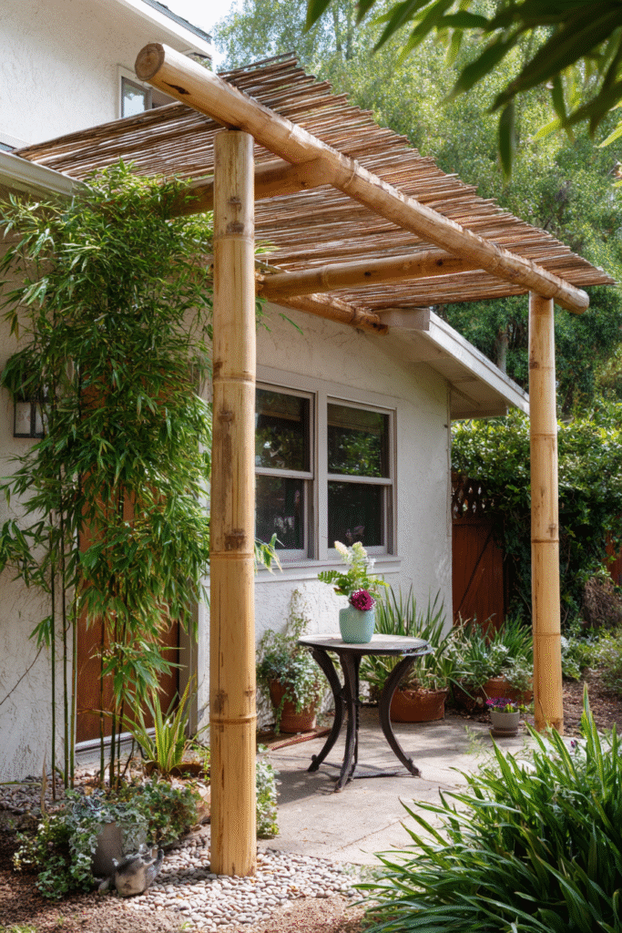 What I adore most about this design is how warm and effortlessly stylish it is, proving that raw, simple materials can look incredibly chic. The use of bamboo is a fantastic budget-friendly trick to add beautiful texture and a unique layer of shade to the top of a basic pergola frame. It’s truly inspiring for those who love a natural aesthetic and want their outdoor space to feel calm, breezy, and completely down-to-earth!