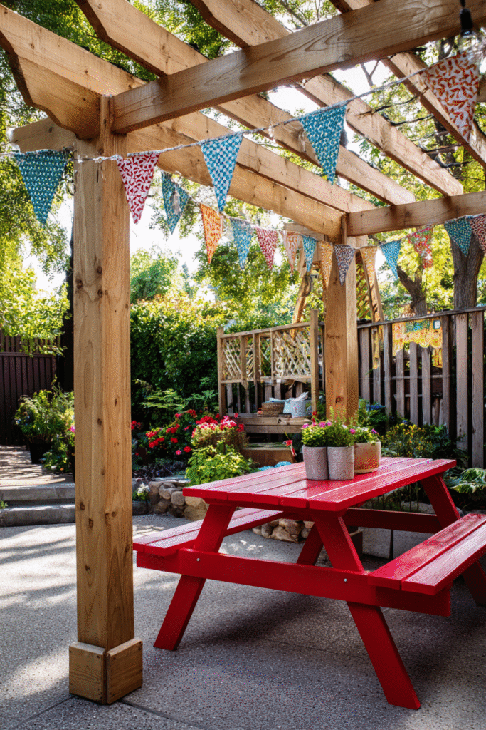 This design is all about embracing a casual, celebratory mood with a rustic, natural wood pergola that’s perfect for summer gatherings. The structure uses thick, visible posts and beams and is wonderfully decorated with colorful flags or banners strung across the top, instantly adding a festive feel. A bright red picnic table underneath provides a central gathering spot and a fantastic splash of cheerful color.