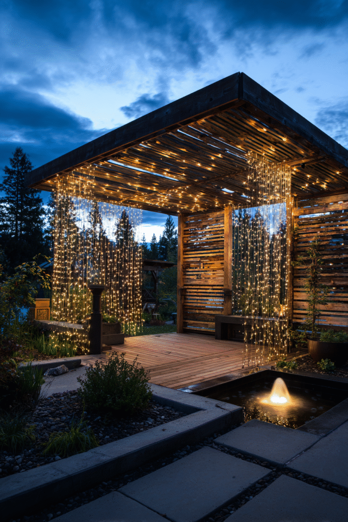 I love that this pergola proves you don’t need a huge area or a big budget to create a truly magical outdoor space—sometimes, a small structure and great lighting are all you need. The hanging plants and the glowing bistro lights give it such a friendly and welcoming vibe, perfect for a glass of wine with your neighbors or a quiet chat. It’s a wonderful reminder that cheap doesn’t mean boring, especially when you use clever lighting to set the mood!