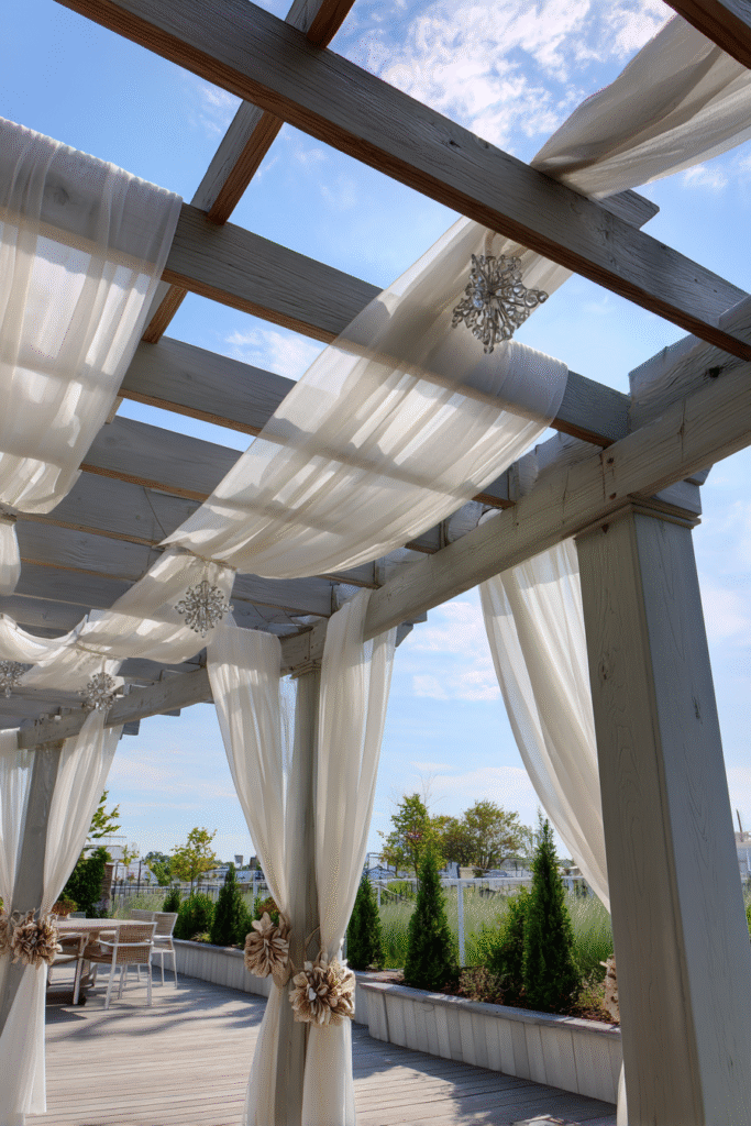 This gorgeous pergola idea is the definition of accessible elegance, using a simple white-painted wood frame dressed up with yards of sheer, flowing white fabric. The fabric is beautifully draped across the top beams to soften the sunlight and hung vertically with chic floral tie-backs to create a sense of romantic enclosure. Set on a bright, elevated patio, it screams high-end wedding or glamorous rooftop lounge.