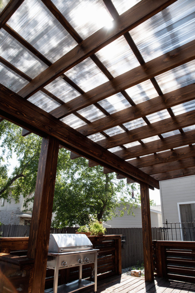 I think this design is absolutely brilliant because it solves the problem of needing weather protection without sacrificing precious natural light. The way the light filters through the clear panels creates a soft, gentle glow, which is so much prettier than a solid roof. This is a must-try budget idea for anyone who wants a functional outdoor cooking or dining space but hates feeling shut in—it’s practical magic!